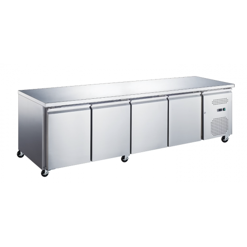 Acest banc de lucru pentru congelator cu patru uși, frumos finisat, oferă o capacitate mare de congelare și un blat de lucru ergonomic. Bancul de lucru pentru congelator are patru rafturi reglabile pe înălțime și uși cu închidere automată.